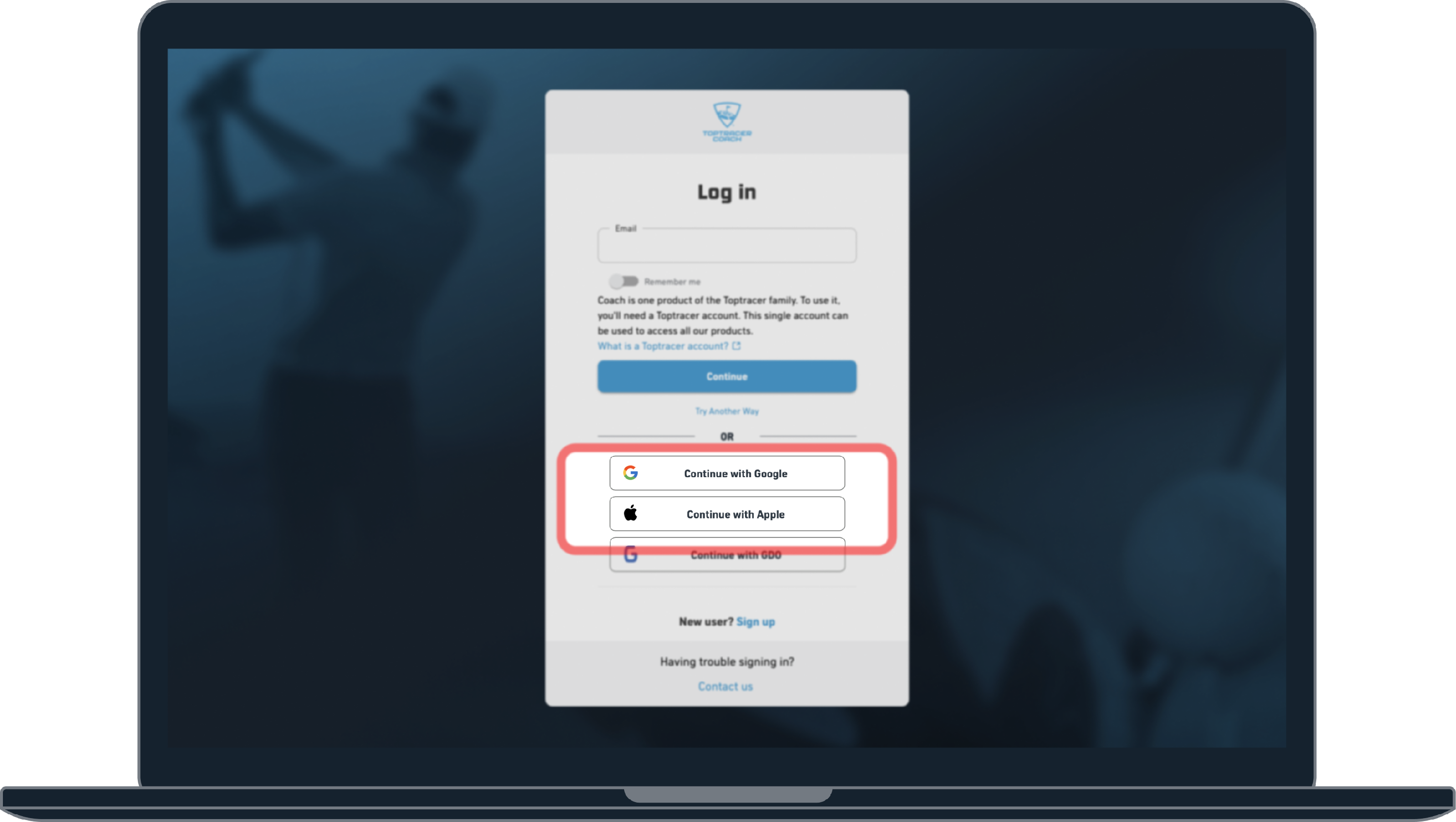 You can now sign in to your Toptracer account using your Google or Apple account. This works for both Toptracer Coach and the Toptracer Range apps (iOS and Android).